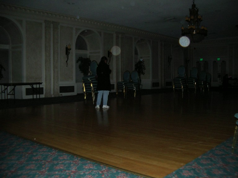 These pictures were taken in the Ballroom of the Ramada Plaza Hotel in Fond du Lac, WI. The top picture has what appears to be 3 orbs in it. I saw them right away on the screen of my digital camera and immediately told Debbie not to move and took another picture. The two pictures where taken within seconds of each other.